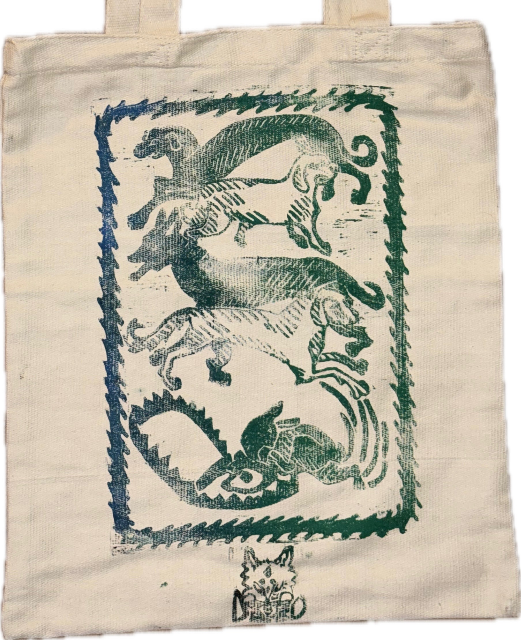 dogs chasing rabbit on canvas tote bag in blue and green gradient